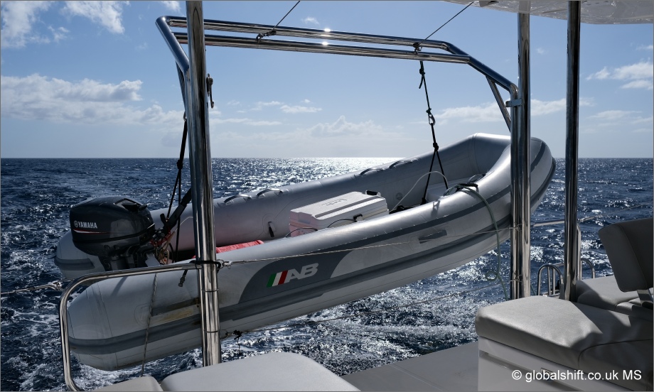 Dinghy on catamaran in the Caribbean