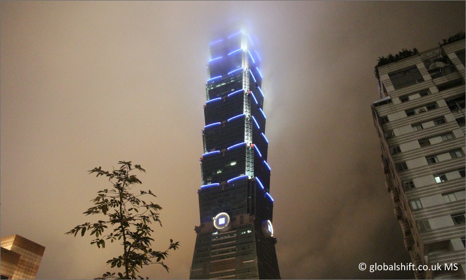 Taipei 101 in night time mist